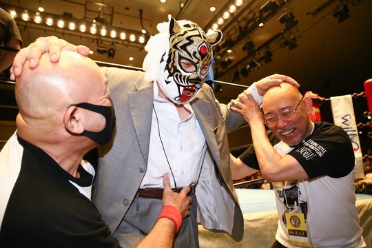 長らく原因不明の病気と闘いリハビリに励む初代タイガーマスク選手。ここ数大会での来場挨拶はすべてリング下からでしたが、この日は軽快な足取りで観客の前に姿を現すと、そのままリングイン! 久々のリング上からの挨拶に会場は大いに沸きました。