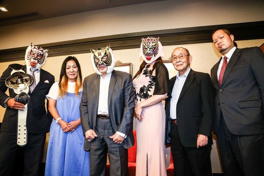 一般社団法人 初代タイガーマスク後援会がサポートしている『ストロングスタイルプロレス』が7月15日、都内ホテルにて7・29後楽園へ向けた記者会見を実施。初代タイガーマスクこと佐山聡名誉顧問、新間寿代表理事が出席したほか、同大会でデビューする女性版タイガーマスク「タイガー・クイーン(TQ)」選手がアドバイザーであるジャガー横田選手とともにマスコミの皆様の前に初登場!!デビュー戦の対戦相手が発表されました。また同門対決が決まったスーパー・タイガー選手と間下隼人選手が参加し、意気込みを述べました。