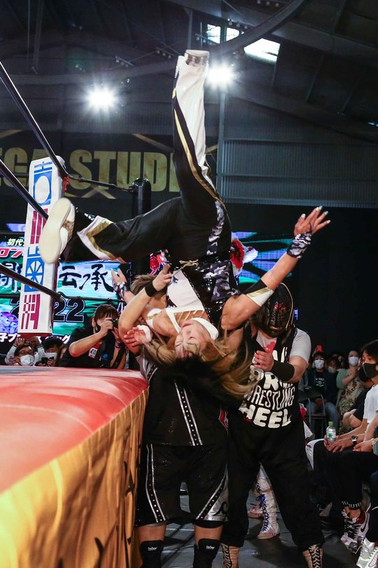 女帝・ジャガー横田選手は、関西を中心に活躍中の花園桃花選手とタッグを組み、極悪同盟のZAP選手とドレイク森松選手のヒールコンビと対戦。金属バッドを振り回す無法者に手を焼いたものの、相手方の誤爆を誘ったジャガー横田選手が変形エビ固めで3カウントを奪いました。