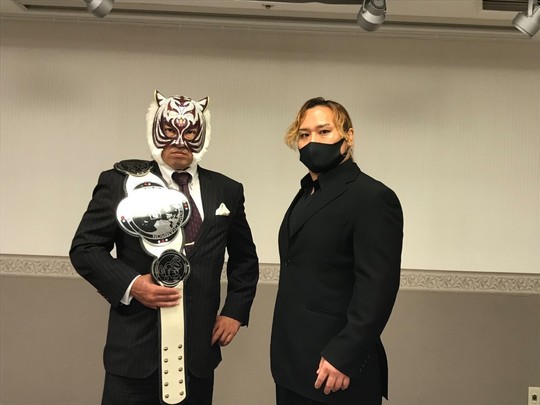 メインイベントはスーパー・タイガー選手と真霜拳號選手によるレジェンド王座戦。前回6・9後楽園大会で真霜選手が挑戦を表明、S・タイガー選手が承諾したことで実現しました。会見では両者そろってコメントし、一週間後の本番へ向けて火花を散らしました。
