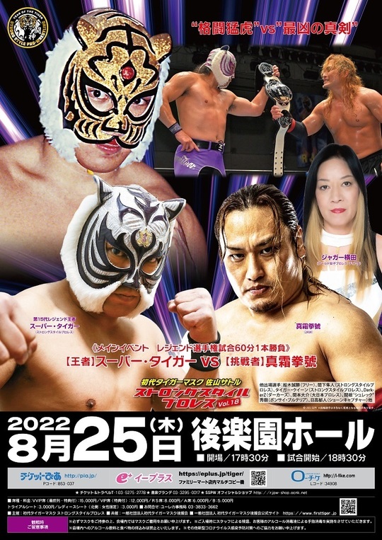 初代タイガーマスク佐山サトル率いるストロングスタイルプロレスが8月25日(木)、東京・後楽園ホールにて「初代タイガーマスク ストロングスタイルプロレスVol.18」を開催が目前に迫った。当日はスーパー・タイガーvs真霜拳號のレジェンド王座戦を筆頭に全6試合がラインナップされており、とくに後半3試合はトリプルメインイベントと呼んでも差し支えないほどの豪華カードがそろった。そこで、各試合の見どころを紹介しよう。