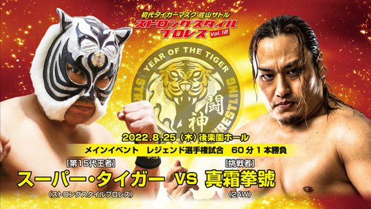 2020年12・17後楽園で藤田和之からストロングスタイルプロレスの至宝であるレジェンド王座を奪回、第15代王者として名実ともに団体のエースに上り詰めたスーパー・タイガーは、これまで河野真幸、間下隼人の挑戦を退け、今回が3度目の防衛戦となる。相手は、2AWの真霜拳號だ。格闘系のスタイルからしても、真霜はスーパーに絶好の対戦相手であり、2AWの強さの象徴とも言える選手とあって、団体の威信をかけた大一番になりそうだ。真霜は3・17後楽園での参戦が発表されながらも体調不良により急きょ欠場、スーパーとの遭遇が流れてしまった。が、6・9後楽園では花見達也を従えて待望の初参戦、スーパー&間下隼人組との対戦は団体対抗戦の様相を呈し、試合はスーパーが花見をフォールし一応の決着をみた。が、当然、真霜がおさまるはずもなく、試合後にはリング上でレジェンド王座への挑戦を表明。スーパーに向かい「一発で取ってやるよ!」とアピールした。他団体のリングでも何度か対戦、はっきりした決着のついていないスーパーに断る理由はなく。今回のタイトルマッチが決定したのである。まずは2AWの7・3千葉で前哨戦がおこなわれ、スーパー&間下組が真霜&仁木琢郎組にメインで勝利、同門の間下をタイトルマッチで破った牙斬(ブレーンバスター式ニーリフト)を挑戦者の目の前で決めてみせたのである。そして迎える今大会、スーパーの牙斬が再び火を噴きベルトを守るのか、それとも真霜の無道(変型羽折りワキ固め)がスーパーをがんじがらめにし、ベルトを千葉に持ち帰るのか。真霜は現2AW無差別級王者で4度の防衛に成功中、今大会に初参戦する入江茂弘からベルトを団体に取り戻した。また、前身のKAIENTAI DOJOでも頂点のベルトを6度巻いているだけに、シングル王者としての経験値ではスーパーを上回っていると言えるだろう。それだけに、スーパーにとっては大ピンチ。ストロングスタイルプロレスの2022年下半期を左右する王者対決に注目だ!