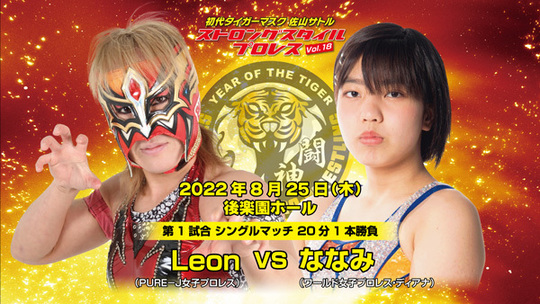 オープニングマッチは、Leonとななみの一騎打ち。今回も女子のカードが3試合組まれ、いずれもジャガー横田のお眼鏡にかなった選手の登場となる。今回、大会の流れを左右するとも言われる第1試合を任されたのは、PUREーJのマスクウーマンLeonだ。Leonはストロングスタイルプロレス初参戦だが、キャリア22年。アルシオンでデビューし、07年にJWP(現PUREーJ)に入団。PUREーJ最高峰の無差別級王座には3度君臨しており、1カ月前にベルトを落としたとはいえ、実力は折り紙付きだ。また、今回は高校一年生のななみが相手とあって、若手の力、ポテンシャルを引き出した上でストロングスタイルプロレスファンも納得できる試合を見せてくれることだろう。ななみがこの試合で何をつかむか。そして、タイガー・クイーンとのマスクウーマン対決にも思いを馳せる。そんな闘いぶりが期待される。