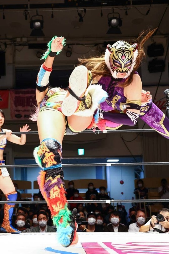 メインイベントにはタイガー・クイーン選手が登場。デビュー2年目ながら井上京子選手・神取忍選手・井上貴子選手という女子プロレスレジェンド勢とカルテットを結成したTQ選手は、気後れすることなく貫録たっぷりにタイガームーブで大きなどよめきを誘うなど躍動。後半は自軍のサポートに回り、京子選手の勝利をアシストしました。