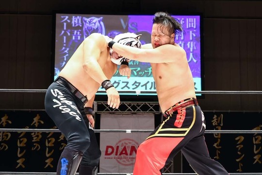 第3試合にはスーパー・タイガー&槙吾組と間下隼人&野村直矢組のストロングスタイルプロレス提供試合が組まれました。スーパー選手と間下選手のバチバチの激しい打撃戦、槙吾選手の華麗な飛び技、野村選手のパワーあふれるファイトで沸かせると、最後は間下選手が必殺のフィッシャーマンズ・スープレックス・ライオットで槙吾選手から3カウント。ディアナファンにSSPWの魅力を存分に伝える試合となりました。