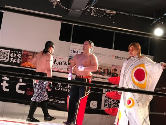 ジャガー横田選手は新井健一郎&ガッツ石島と組んで登場。井上京子選手とストロングスタイルプロレスの間下隼人選手、洞口義浩選手の異色トリオと激突しました。