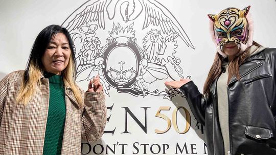 タイガー・クイーン選手と、TQアドバイザー・ジャガー横田選手が31日、東京・西武百貨店渋谷店特設会場で行われている『QUEEN50周年展-DON’T STOP ME NOW-』を訪れ、TQ選手の入場曲「DON’T STOP ME NOW」の世界を体感しました。