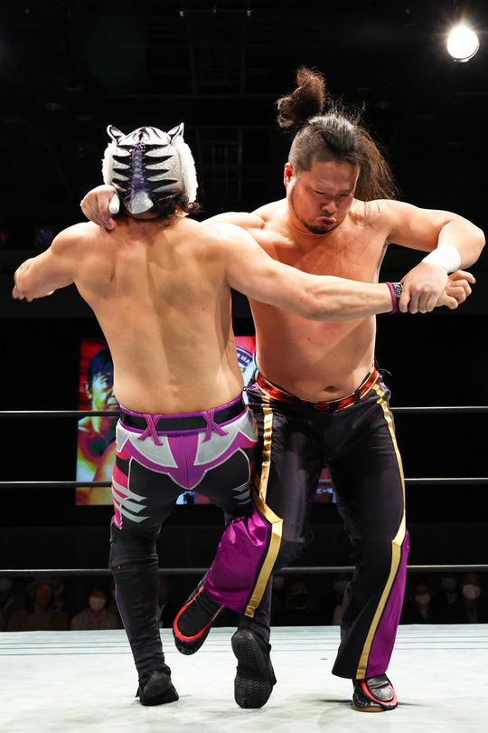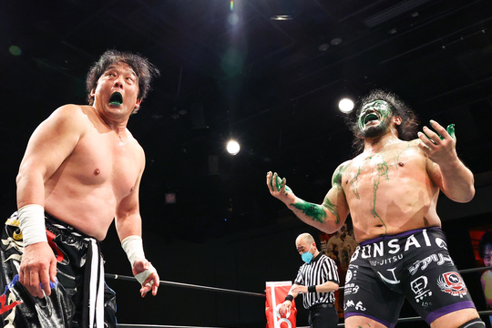 関本大介&TAJIRIvs関根“シュレック”秀樹&日高郁人は、TAJIRI選手が関本選手をも巻き込んだ“らしさ”全開で試合の主導権を握り続け、関根選手にグリーンミストを噴射。顔面を真緑に染めた関根選手がその名のとおり“シュレック”と化して覚醒し大暴れする誤算はあったものの、その混乱に乗じた丸め込みで日高選手から3カウント。涼しい顔でバックステージへと消えていきました。