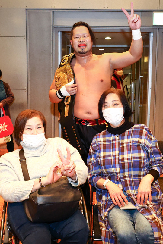 ご当地・九州プロレスの各選手、福岡県出身選手らが多数参戦したSSPW初の博多大会のメインイベントには、2・22後楽園で悲願だったレジェンド王座を獲得したばかりの間下選手が登場。間下選手の母とおば、そしてたくさんの友人が応援に駆けつけるなか、船木誠勝選手とタッグを結成し、スーパー・タイガー&将軍岡本組と激突しました。間下選手はスーパー選手の鋭い打撃、将軍岡本選手の圧倒的なパワーに押し込まれる場面もあったものの、百戦錬磨の船木選手のアシストを得て立て直しに成功。最後はSTOボンバーで押し切って将軍岡本選手から3カウントを奪いました。