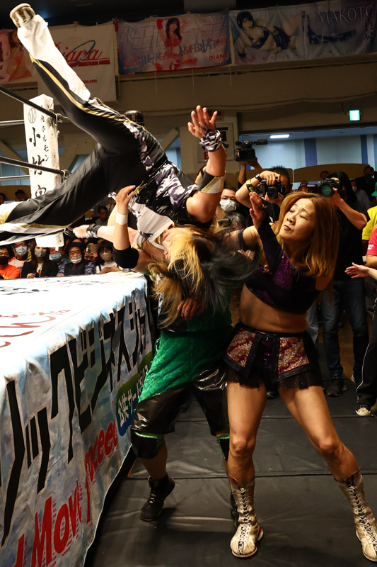 また同大会でも異様な盛り上がりを見せたのは、井上京子選手とウナギ・サヤカ選手のスペシャルシングルマッチ。SSPW2・22後楽園に参戦し強烈なインパクトを残したウナギ選手が、前のめりに井上選手に突っ込み、場外戦では南側客席階段から井上選手を蹴落とすなど大暴れ。最後は井上選手のパワーボムに沈みましたが、経験・技術・パワーではるかに上回る井上選手を相手に何度も見せ場を作るなど素晴らしい試合内容で、場内は大歓声に包まれました。