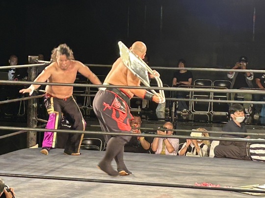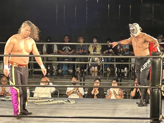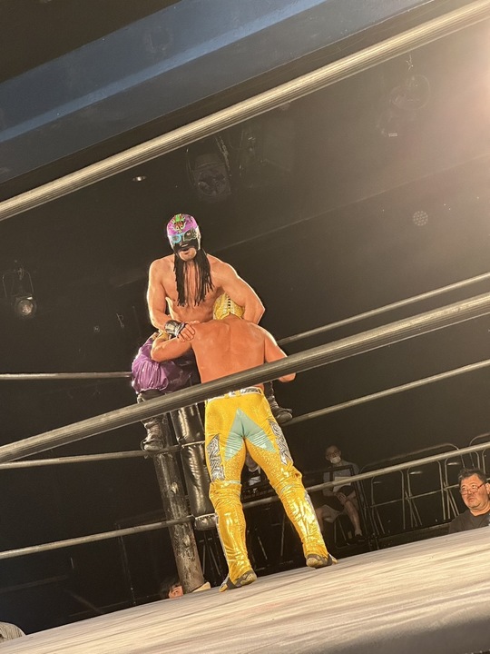 同大会には、SSPW所属であるレジェンド王者・間下隼人選手とスーパー・タイガー選手が参戦し、佐藤耕平選手&将軍岡本選手と対戦。将軍岡本選手の反則により、間下組が勝利しました。
