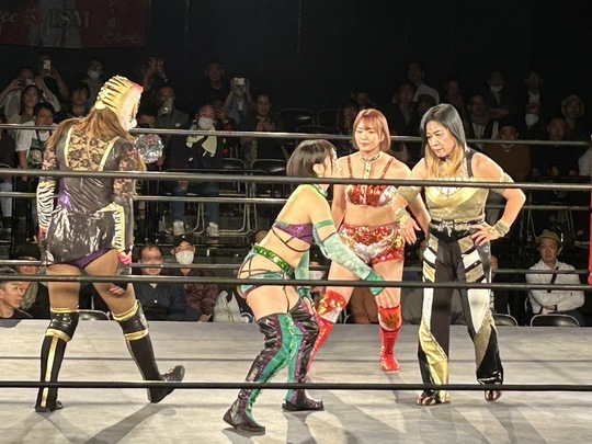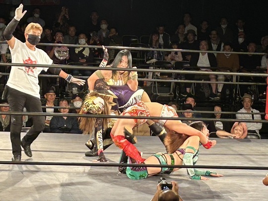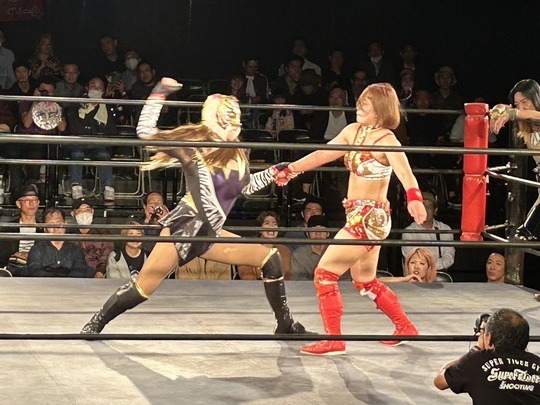 ジャガー横田選手はSareee選手との師弟タッグで、本間多恵選手と組んだタイガー・クイーン選手と激突。Sareee選手とクイーン選手は緊張感あふれる打撃戦を繰り広げました。終盤、Sareee選手と見事なタッグワークを見せたジャガー横田選手が本間選手から3カウントを奪取しました。
