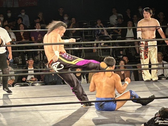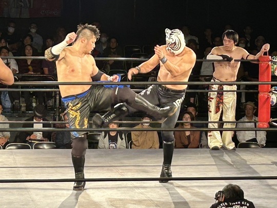 メインイベントに登場したのは、間下隼人選手とスーパー・タイガー選手。間下選手が橋本大地選手&中津良太選手と、スーパー・タイガー選手は旭志織選手&青木優也選手とそれぞれ組んで出陣。メインイベントにふさわしいバチバチの打撃戦の末、青木選手が袈裟斬りチョップで中津選手を沈めました。