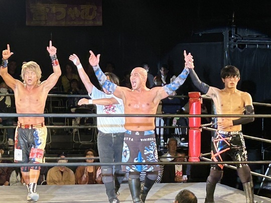 日高郁人選手は、槙吾選手&新選手とのトリオで、関札皓太選手&レイトン・バザード選手&エンデル・カラ選手の大日本プロレス軍と、場内を熱狂に導く空中戦を展開。最期は日高選手がソラリーナで関札選手から勝利しました。