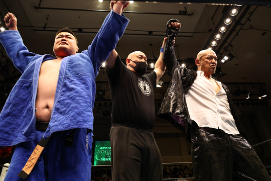 なお今大会は「力道山先生没60年追悼興行」。第4試合前、初代タイガーマスクと新間寿代表理事がリングに上がり、追悼セレモニーなどを実施しました。力道山の次男でありプロレスラーの百田光雄選手、孫で同じくプロレスラーの百田力選手も駆けつけ、故人をしのぶ10カウントが打ち鳴らされました。