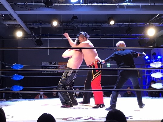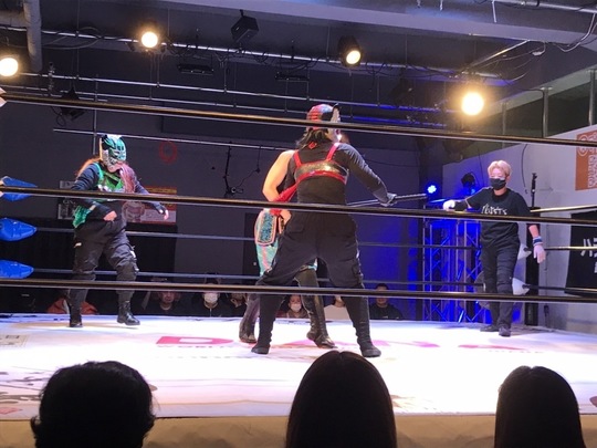 間下選手はCRYSISの洞口義浩選手と一騎打ち、ダーカーズは佐藤綾子&マドレーヌ組とのタッグ対決に臨みました。SSPWvsCRYSISの対抗戦ともいえるこの2試合は、どちらもSSPW側が勝利しました。