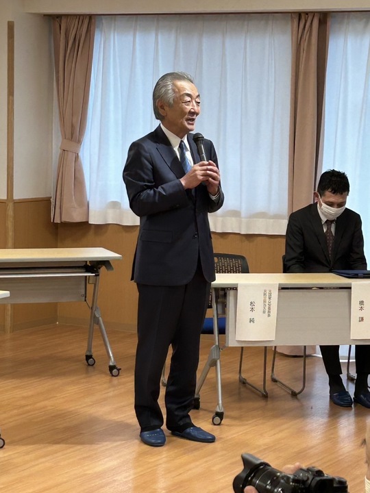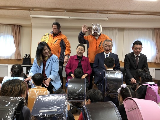 ランドセル贈呈式には、当後援会相談役のジャガー横田選手、SSPW選手会長のスーパー・タイガー選手、第17代レジェンド王者・間下隼人選手が出席。また来賓として、元国家公安委員長・元防災担当大臣の松本純氏にもお越しいただき、ご挨拶を頂戴いたしました。なお、大変残念ながら初代タイガーマスクこと佐山聡名誉顧問は、体調不良のため欠席となりました。