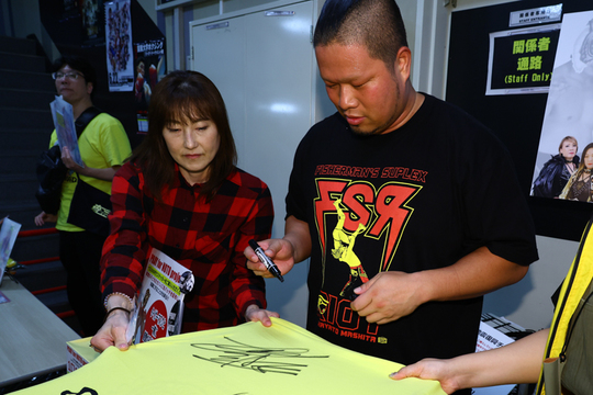 当後援会では、ジャガー横田選手や間下隼人選手、スーパー・タイガー選手らが出場するプロレス2試合(女子・男子タッグマッチ各1試合)の提供とチャリティグッズの販売を予定しています。イベント当日に先駆け、ジャガー横田選手・尾崎魔弓選手の合同興行「age115 君臨」6・18後楽園大会にて、チャリティグッズ即売会を実施。ストロングスタイルプロレスのレジェンド王者である間下選手が、初代タイガーマスクがデザインされたオリジナル「PRAY for NOTO ステッカー&缶バッジ」ほか、初代タイガーTシャツ、スポーツタオル、ハンドタオルなどを、ファン一人ひとりと触れ合いながら販売しました。