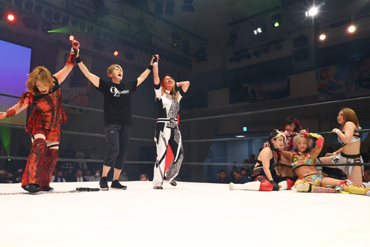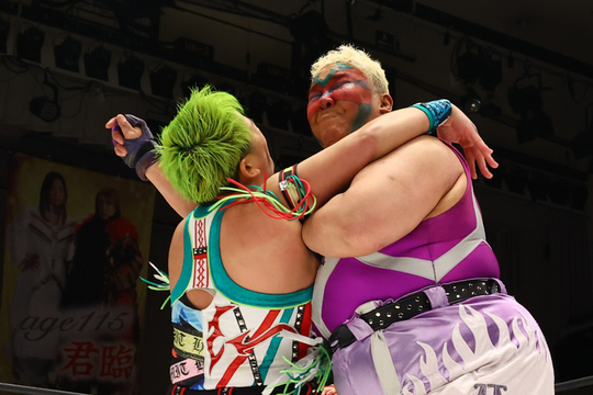 メインイベントは本日主役のジャガー横田選手と尾崎選手がタッグを組んで出陣する115歳対決ハンディキャップマッチ。2人の年齢を合わせて「age115」のジャガー横田&尾崎組が、4人で合計115歳となる志田光&花園桃花&ウナギ・サヤカ&稲葉ともか組を迎え撃ちました。数では劣勢を強いられ、尾崎選手の毒霧攻撃がジャガー横田選手に誤爆するなど危険な場面もあったものの、ジャガー横田選手がダブルインパクト式の竹刀攻撃をリバース・ウラカンラナで切り返してガッチリと固め、逆転勝利を収めました。
