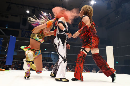 セミファイナルには、初代タイガーマスクのチャリティ精神を伝承するSareee選手が登場。アジャコング選手との強力タッグで、水波綾&優宇組と対戦。水波選手の独特なムーブに翻弄され、優宇選手の豊満なボディに押されるシーンもありましたが、Sareee選手の好アシストを受けたアジャコング選手が裏拳を炸裂させ、優宇選手から3カウントを奪いました。