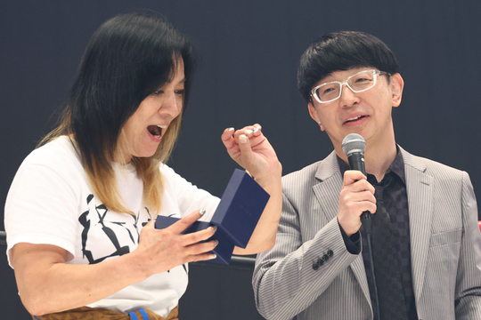 また同大会開始前には、ジャガー横田選手の夫であり医師の木下博勝氏と長男の大維志君がリングに登場。試合前のジャガー横田選手のピリピリ具合を暴露した上で、主役であるジャガー横田選手と尾崎魔弓を呼び込みました。主役2人の挨拶ののち、大維志君が20年前のこの日、ジャガー横田選手&木下医師の入籍記念日であることを明かし、場内が祝福の声が。また木下医師からヴィトンのリングの指輪が渡される微笑ましい場面もありました。
