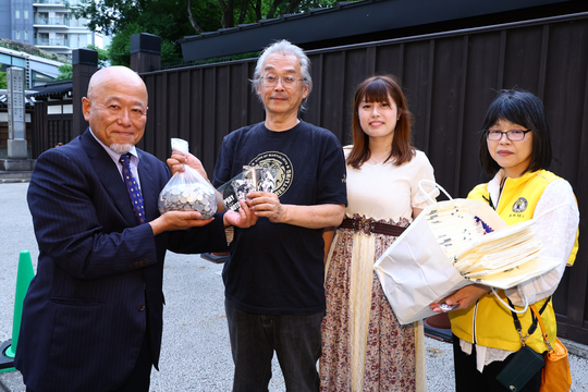 また当後援会が支援する一般社団法人レスキュードアニマルネットワークの河合弘代表より、能登地震復興促進イベントへ「1円玉5万枚」の寄付をいただきました。寄付金は「能登に笑顔を実行委員会」メンバーの前田和憲氏(石川県妙成寺・観光営業部長)に直接手渡され、前田氏からはイベントオリジナル「PRAY for NOTO ステッカー&缶バッジ」、後援会からはTシャツとタオルをそれぞれ贈らせていただきました。河合代表に心から感謝を申し上げます。