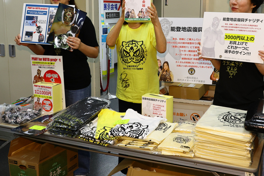 なお、初代タイガーマスクがデザインされたオリジナル「PRAY for NOTO ステッカー&缶バッジ」は1セット1000円でSSPW後楽園大会でも販売。1セットにつき、能登の子どもたち7人に缶バッジがプレゼントされます。またTシャツや各種タオルなど当後援会グッズも後楽園大会売店にて販売し、売り上げ全額を「能登に笑顔を実行委員会」に寄付いたました。ご協力いただきました皆様、ありがとうございました。