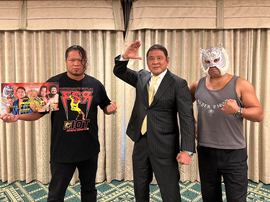 初代タイガーマスクも出席した会見には、先日、SSPW初参戦が発表された新日本プロレス・永田裕志選手が登場。「永田&スーパー・タイガー組vs間下隼人&関根“シュレック”秀樹組」も発表され、永田選手、スーパー選手、間下選手が注目の一戦への意気込みを語りました。