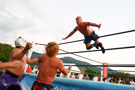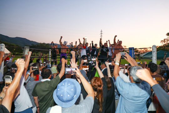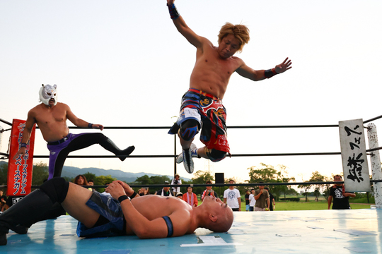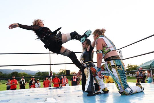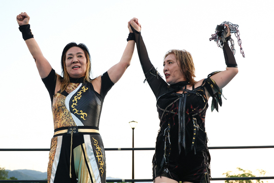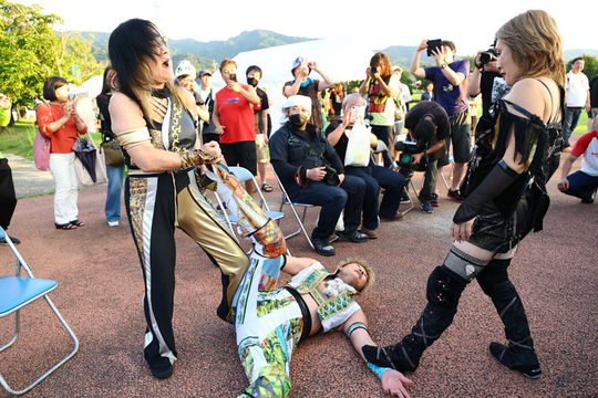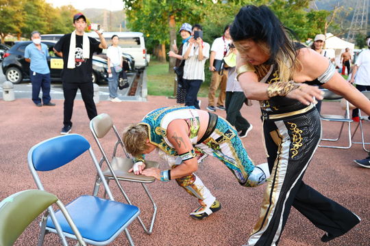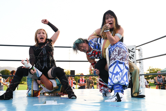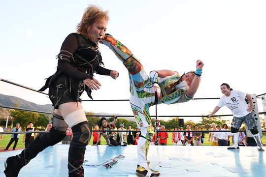 強い日差しが照りつける中、始まったジャガー組vs加藤組の一戦はジャガー組の奇襲&場外乱闘で幕開け。リングに戻っても、ジャガー横田選手がレフェリーを巧みに翻弄したり暴行したり、尾崎選手がチェーン攻撃を繰り出したりとやりたい放題で観客から大歓声を引き出しました。終盤、尾崎選手がシャイニング・ウィザード式のケンカキックを孤立したAKINO選手にズバリと決めると、すかさずジャガー横田選手が丸め込んで勝利。圧倒的な存在感を見せつけました。