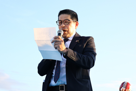 ストロングスタイルプロレスのコミッショナーで参議院議員の和田政宗氏の秘書である栗林寿行氏にも、準備段階からご尽力いただきました。当日はSSPW提供試合前のご挨拶、「PRAY for NOTO project」による子どもたちへの缶バッジ+ステッカー配布、サインボール投げなど、残暑の厳しい屋外にもかかわらず、多大なご協力を賜りました。