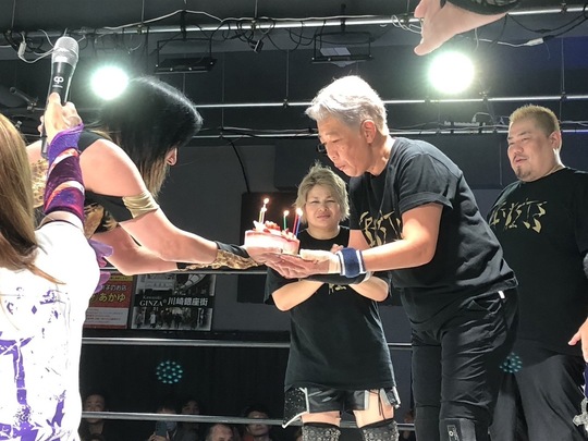 試合後、SSPWのリングでもおなじみのレフェリーTommy氏の誕生日を祝し、ジャガー横田選手からケーキのプレゼントがありました。