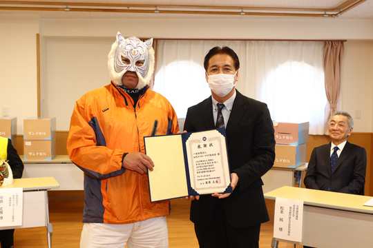 ランドセル贈呈式には、ストロングスタイルプロレスから選手会長でSSPWレジェンド王者のスーパー・タイガー選手、間下隼人選手、タイガー・プリンセス選手、当後援会の斎藤政一専務理事、平井丈雅事務局長らが出席。また来賓として、元衆議院議員で自由民主党最高顧問麻生太郎特別補佐の松本純氏にもお越しいただき、ご挨拶を頂戴いたしました。なお、大変残念ながら初代タイガーマスクこと佐山聡名誉顧問は、体調不良のため欠席となりました。