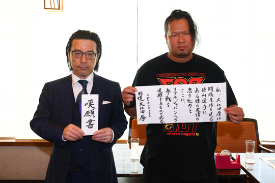 しかし、平井代表はこれまでの初代タイガーと大仁田選手の歴史を振り返るだけで、肝心の返答はせず。そんな平井代表の様子に、矢口選手はもちろん同席していた間下隼人選手も呆れ顔。ブツブツと何かを語り続ける平井代表を無視して、両選手は手を組み、対戦に合意しました。