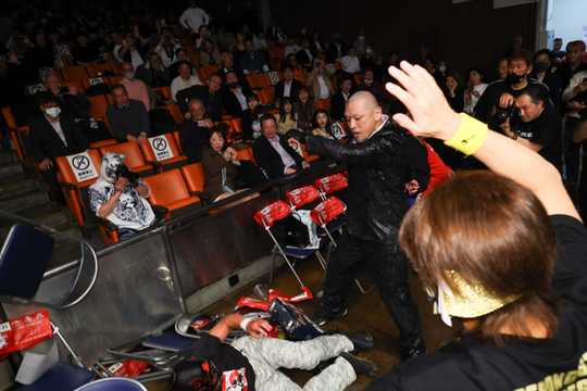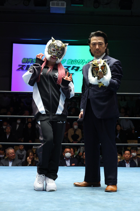試合後、大仁田選手はSSPWマットでの電流爆破戦開催を一方的に宣言。間下選手が受けて立つ構えを見せると、初代タイガーマスクこと佐山サトル総監への応援メッセージとともに「1、2、3、ファイヤー!」を絶叫しました。