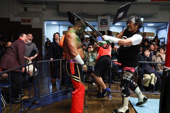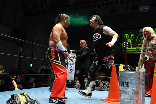 大仁田厚率いる邪道軍と、間下隼人&村上和成&関根“シュレック”秀樹組の一戦は、大仁田選手の毒霧噴射で幕開け。反則なしのやりたい放題のルールの中で、顔面を緑色に染め、目が見えない間下が捕まる展開に。有刺鉄線ボード・バッド、看板やパイプ椅子などの凶器が飛び交い、一進一退の攻防が繰り広げられました。