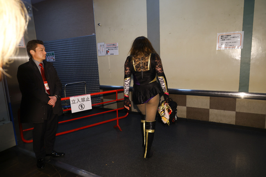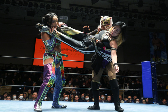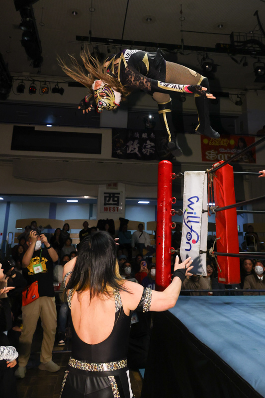 セミファイナルはジャガー横田&AZM組vsタイガー・クイーン&野崎渚組のタッグマッチ。ベテランらしい巧みな試合運びでリング上をコントロールするジャガー横田選手、高速爆弾娘との異名にふさわしいスピーディかつ軽やかな動きでリングを縦横無尽に駆けまわるAZM選手、タイガー殺法で場内を沸かすクイーン選手、華やかな風貌で観客をくぎ付けにする野崎選手と、個性的な4選手が一堂に会した一戦は、ジャガー横田選手が“弟子”であるクイーン選手から3カウントを奪って決着。終了後、花道でマスクを脱ぎ捨て、後ろ姿をファンに見せながら去ったクイーン選手は、バックステージに素顔で現れ、女子プロレスラーのVENYであることを明かしました。本大会がクイーンとしての最終試合となることを発表、そのうえで「また巡りあえたら」とクイーン再登場にも含みを持たせました。