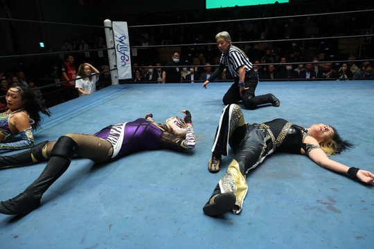 第3試合ではsareee&Chi Chi組vsダーク・ウナギ&AKARI組の女子タッグマッチも行われました。sareee&Chi Chi組はダブル卍固めを披露するなど息の合った好連係で相手方に攻勢に出ると、最後はsareee選手がダイビング・フットスタンプでAKARI選手を沈め、場内を大きく沸かせました。