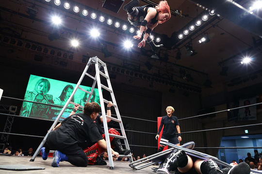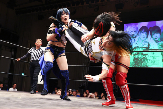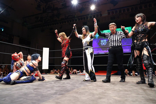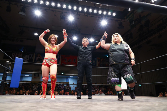 このほか、客席から悲鳴が上がるほど凄惨な闘いとなったDASH・チサコvs世羅りさvs夏美もちのハードコアルール3WAYマッチ、10選手の思惑が交錯しめまぐるしく戦況が変わるアルテミス・ロワイヤル選手権試合(変則ルールバトルロイヤル)、IWGP女子王者のSareee選手が伊藤薫選手と組み、神姫ミサ&YuuRI組と対戦した女子タッグマッチなど豪華カードに場内は大盛り上がりとなりました。