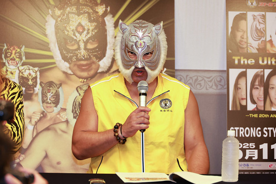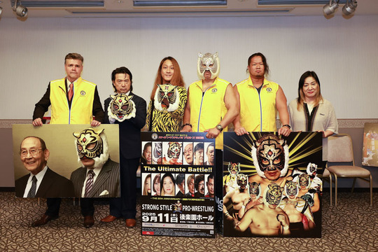 一般社団法人初代タイガーマスク後援会が後援するストロングスタイルプロレスが28日、9・11後楽園大会へ向けた会見を都内で実施しました。ジャガー横田選手、間下隼人選手、スーパー・タイガー選手、初参戦となる黒潮TOKYOジャパン選手が出席したほか、レジェンド王者・船木誠勝選手のビデオメッセージを放映。各選手が目前に迫った一戦へ意気込みを語りました。