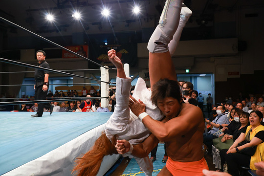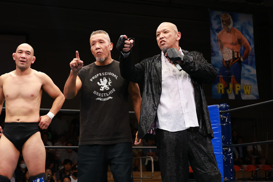第4試合に行われたのは、9・28電流爆破戦を控える間下選手と大仁田選手の前哨戦が組まれました。間下選手は関根選手&洞口義浩選手、大仁田選手は雷神矢口選手&リッキー・フジ選手との各トリオで、リング内外を縦横無尽に暴れまわりました。間下選手と洞口選手が毒霧を被弾し、関根選手が矢口選手&リッキー選手に足止めされるなどSSPW軍は劣勢となりましたが、間下選手が相手方から凶器のギターを奪い取ると、大仁田選手の脳天にフルスイング。大将が戦線離脱し孤立無援となったリッキー選手を仕留め、電流爆破戦へ弾みをつけました。