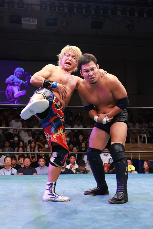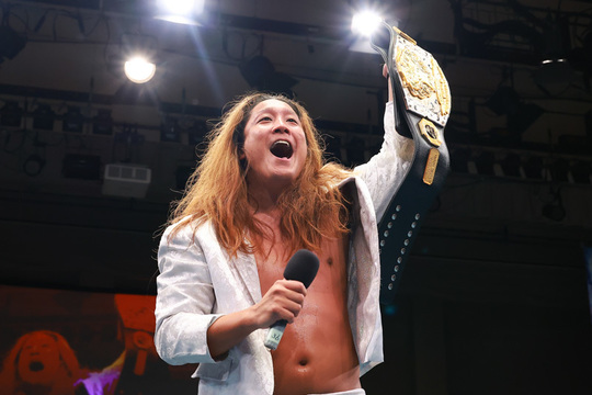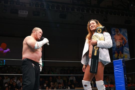 が、船木選手は肩を押さえたまま立ち上がれず、レフェリーがストップをかけて王座戦は3分58秒でまさかの幕切れに。会場が騒然とする中、その結果に一番驚く黒潮選手がベルトを受け取りました。マイクを握った黒潮選手は自身を「not ストロングスタイル」としながらもベルト奪取に大喜び。一方で「これから謝罪の日々が始まる……」と表情を曇らせました。その後、立ち上がった船木選手はリングサイドに歩み寄り、自らの言葉で会場のファンに「脱臼した」とケガの状況をしっかりとした口調で説明。普段と変わらぬ様子の表情で、リベンジマッチへの意欲を燃やしました。