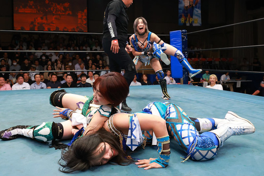 Sareee選手は彩羽選手とのコンビで、NØRI&光芽ミリア組と対戦しました。Sareee選手と彩羽選手の圧倒的強さにブーイングも飛ぶ中、NØRI選手と光芽選手は意地の粘りを見せて場内は大歓声。最後は彩羽選手のランニングスリーで決着しましたが、NØRI選手と光芽選手の健闘に大きな拍手が送られました。