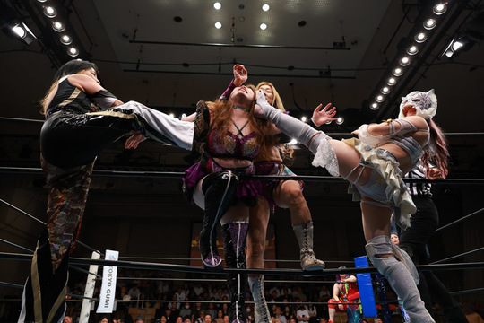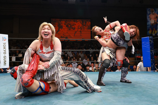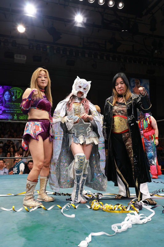 セミファイナルはSSPW女子タッグ王者のジャガー横田&薮下めぐみ組がスターダムのスターライト・キッド選手とトリオを結成。世羅りさ&柊くるみ&夏実もち組のプロミネンス軍と対峙しました。ジャガー横田選手は、体格とパワーで圧倒にかかるプロミネンス軍の猛攻をしのぐと、薮下選手・キッド選手のアシストを受けて、フィッシャーマンズバスターで夏実選手から3カウントを奪いました。