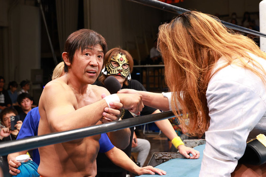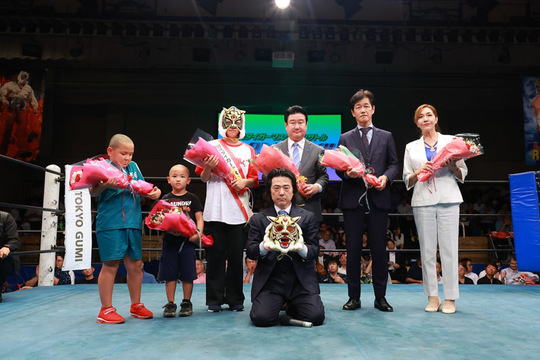 会場での挨拶を予定していた初代タイガーマスクこと佐山サトル名誉顧問ですが、この日は体調不良のため、残念ながら欠席となりました。リングでの花束贈呈のため来場していた青木恵子さん(ブル中野)の呼びかけで、場内のファンが一つになり、佐山名誉顧問に向けて「頑張れ」を大合唱しました。