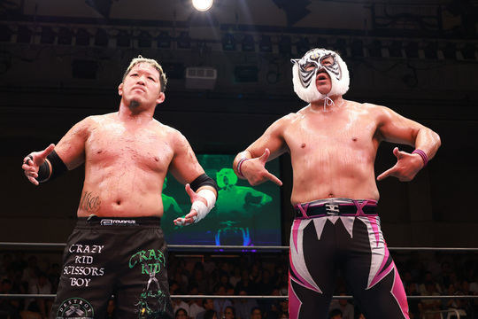 連続参戦となったタイガーマスク選手(4代目/新日本)は、SUGI選手と組み、日高郁人&阿部史典組と対戦。ジュニアのスピーディーで華麗な技の攻防で場内を大いに沸かせました。