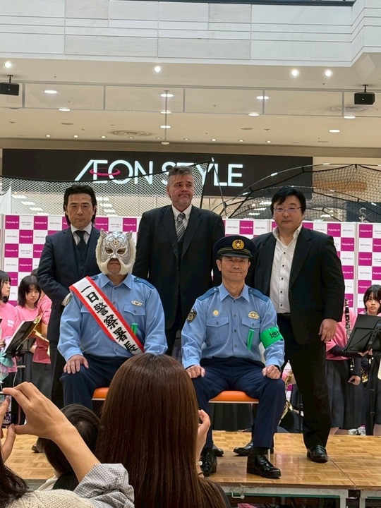 イオンモール佐野新都市にて開催されたこの催しは、地域の安全・防犯意識の向上を目的に、地元警察署が実施したもの。多くの人でにぎわう大型ショッピングモールで、S・タイガー選手が地域安全へ向けたメッセージを送り、市民の皆様と交流しました。