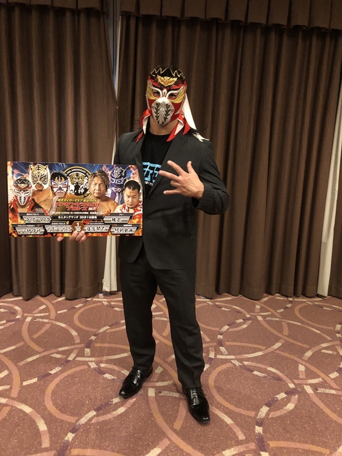 さらにザ・グレート・サスケ&タイガーマスク&ハヤブサvs日高郁人&政宗&阿部史典の豪華6人タッグマッチも組まれました。初参戦となるハヤブサ選手は「素敵なカードを組んでもらいました。ハヤブサらしく試合をし、当日は恥ずかしくてない試合をして勝利したいです」とコメントしました。