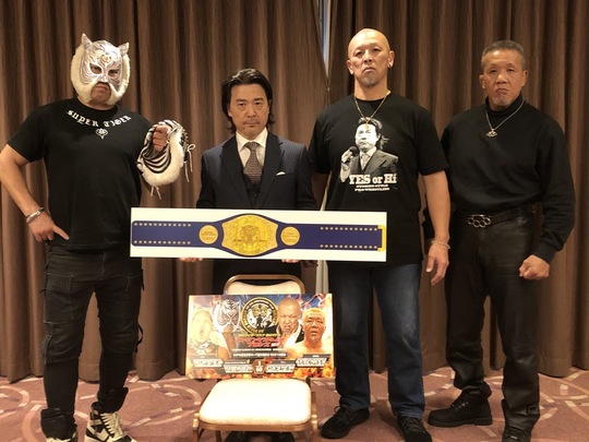 一般社団法人初代タイガーマスク後援会が後援するストロングスタイルプロレスが13日、12・4後楽園大会へ向けた会見を都内で実施しました。会見には初代タイガーマスクこと佐山サトル名誉顧問をはじめ、スーパー・タイガー選手、間下隼人選手、村上和成選手、高橋“人喰い”義生選手、ハヤブサ選手、MIRAI選手が出席しました。