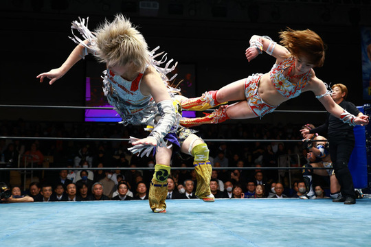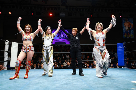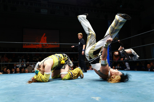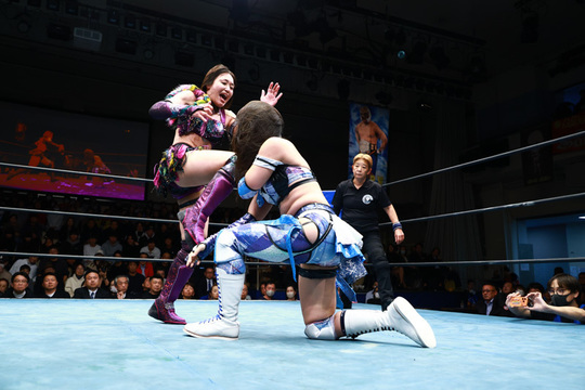 朱里&八神蘭奈組vs櫻井裕子&ChiChi組は、華やかながら力強い打撃戦に場内は大きなどよめきに包まれる場面も。現IWGP女子王者として終始、他を圧倒した朱里選手が朱雀で櫻井選手から勝利を収めました。