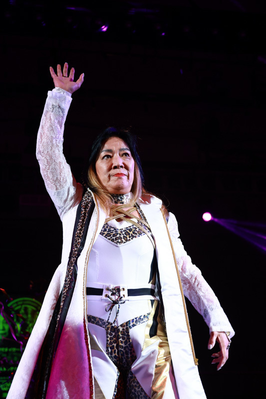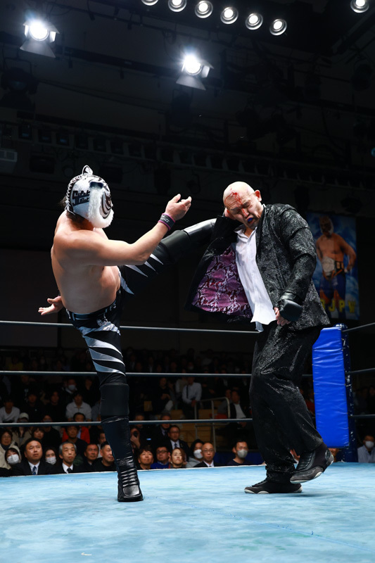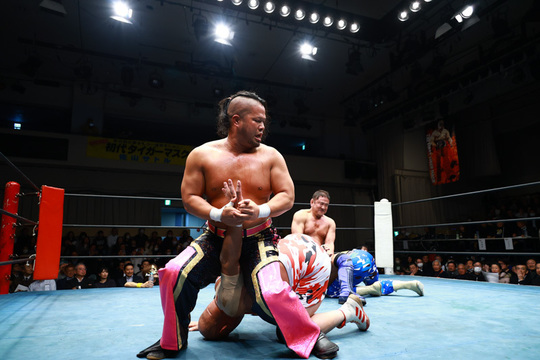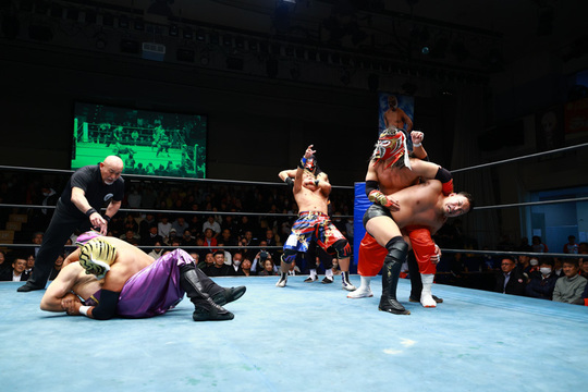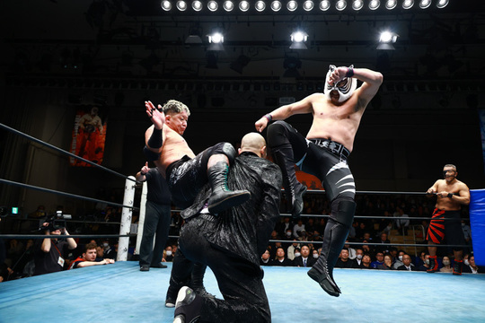 第2試合には、ザ・グレート・サスケ&タイガーマスク(新日本)&ハヤブサと日本を代表するマスクマンが勢ぞろい。日高郁人&政宗&阿部史典組との6人タッグマッチで場内を沸かせました。サスケ選手が独特の世界観で場内を困惑させれば、タイガーマスク選手が艶やかな技を披露。ハヤブサ選手もリングを無重力で駆けまわりました。持ち前のスピードと連係で最後まで食い下がる相手方を、サスケ&ハヤブサが場外に舞って分断。タイガーマスク選手が逆打ちで政宗選手から3カウントを奪いました。